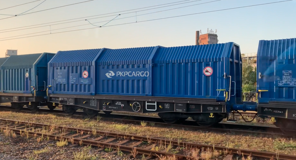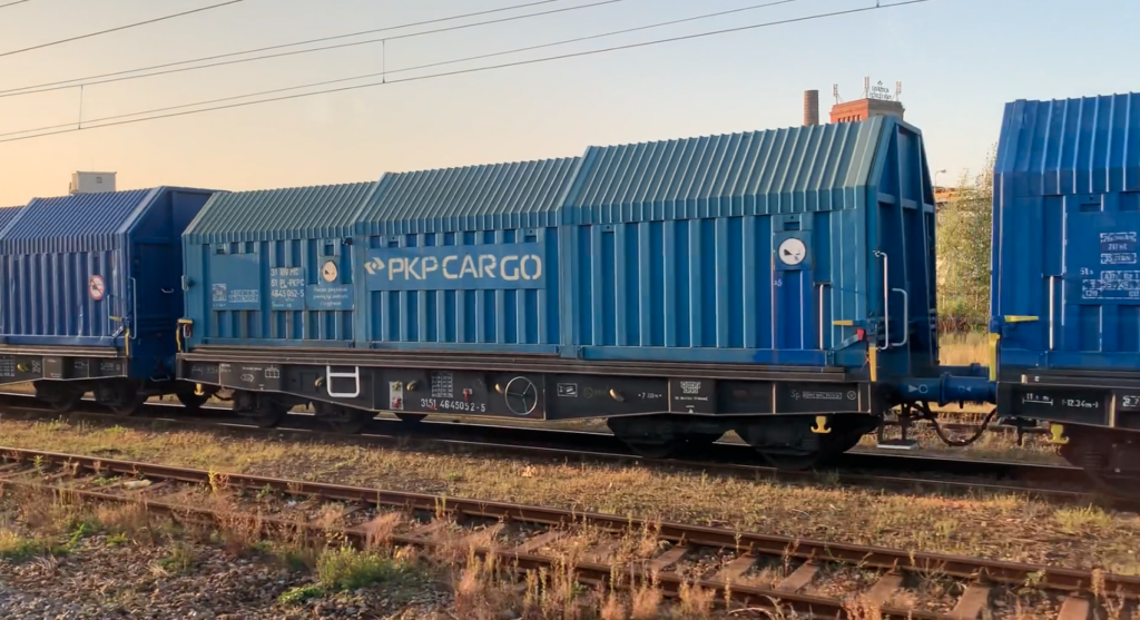 This special-purpose 4-axle flatbed freight wagon type 425S, Simms, is equipped with a movable roof. The walls and roof consist of three elements that slide along the wagon’s axis. This allows access to the interior for two-thirds of the wagon’s length. The wagon’s end walls are fixed and immovable. The roof completely protects the goods from weather conditions (snow, rain, solar radiation). The wagon was initially designed to transport sheet metal coils. The sheet metal coils are placed in saddles, which prevents them from shifting. Subsequent versions of the wagons were equipped with removable fifth wheels, enabling the transport of other goods.
