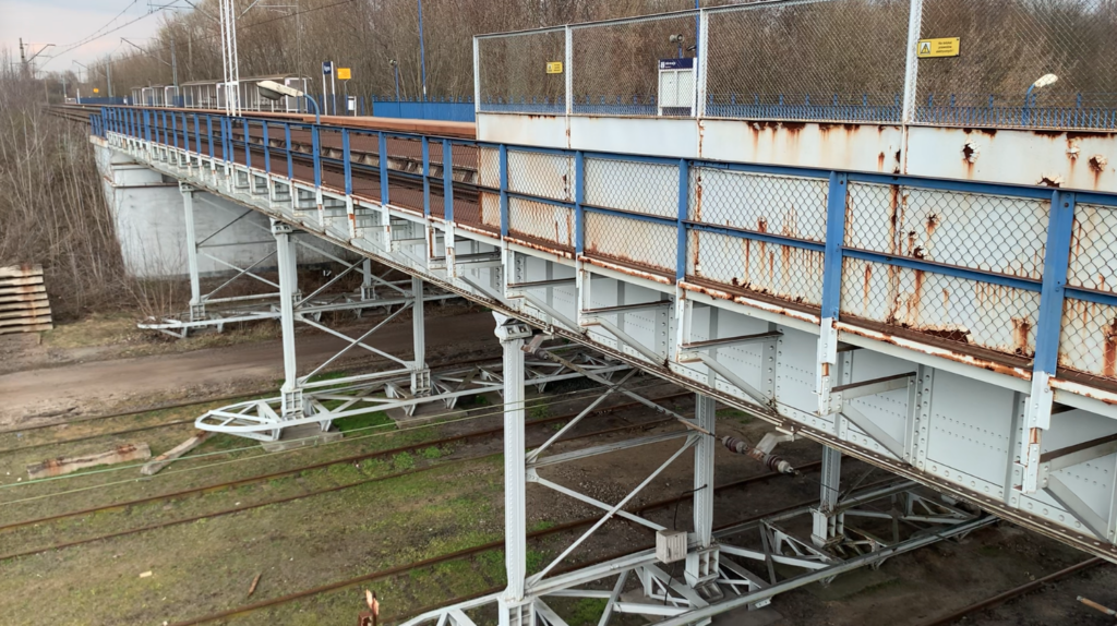 Wiadukt kolejowy nad torami został wykonany ze stali, metodą nitowania. Podpory są stalowe, a przyczółki są ceglano-betonowe. Stalowe podpory są osłonięte stalowymi odbojnicami, aby chronić konstrukcję mostu. Tory na wiadukcie mają drewniane podkłady. Większość torów na dole stacji są położone na drewnianych podkładach. Pozostałe są na podkładach żelbetonowych. Obecnie (2026 roku) na stacji jest duża hałda tłucznia dla nowych torów. Są także składowane stare podkłady żelbetonowe i zużyte szyny.