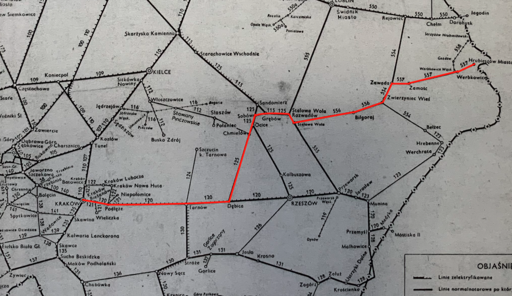 Trasa oraz rozkład jazdy; Hrubieszów Miasto 06:43. Werbkowice 06:54-06:55. Zamość Wschód 07:26-07:27. Zamość Starówka 07:30-07:31. Zamość 07:34-07:36. Zawada 07:46-07:47. Szczebrzeszyn 07:57-07:58. Zwierzyniec 08:07-08:08. Tereszpol Biłgorajski 08:18-08:19. Biłgoraj 08:27-08:29. Stalowa Wola Centrum 09:08-09:10. Stalowa Wola Rozwadów 09:13-09:16. Tarnobrzeg 09:42-09:43. Mielec 10:14-10:16. Dębica 10:37-10:38. Tarnów 10:54-10:56. Kraków Płaszów 11:28-11:29. Kraków Główny 11:34.