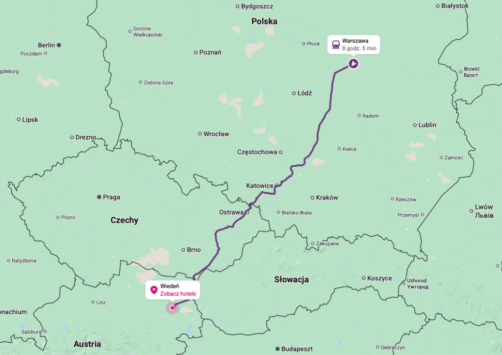 Rozkład jazdy Warszawa – Wiedeń 109 Sobieski; Warszawa Wschodnia 13:44, 0 km. Warszawa Centralna 13:50 – 14:05, 6 km. Warszawa Zachodnia 14:09 – 14:12, 10 km. Opoczno Południe 15:06 – 15:07, 140 km. Włoszczowa Północ 15:34 – 15:35, 212 km. Zawiercie 16:08 – 16:09, 279 km. Dąbrowa Górnicza 16:25 – 16:28, 308 km. Sosnowiec Główny 16:38 – 16:39, 317 km. Katowice 16:55 – 16:58, 327 km. Tychy 17:15 – 17:20, 344 km. Rybnik 17:48 – 17:49, 381 km. Wodzisław Śląski 18:03 – 18:04, 394 km. Chałupki 18:22 – 18:23, 412 km. Bohumín 18:30 – 18:42, 418 km. Ostrava hl.n. 18:49 – 18:51, 429 km. Ostrava-Svinov 18:57 – 18:59, 436 km. Hranice na Moravě Closure 19:24 – 19:26, 489 km. Přerov 19:46 – 19:49, 520 km. Otrokovice 20:06 – 20:08, 554 km. Staré Město u Uh.Hrad 20:20 – 20:21, 574 km. Hodonín 20:37 – 20:38, 614 km. Břeclav 20:49 – 20:55, 639 km. Wien Hbf 21:49 – 21:53, 728 km. Wien Westbahnhof 22:10, 732 km.