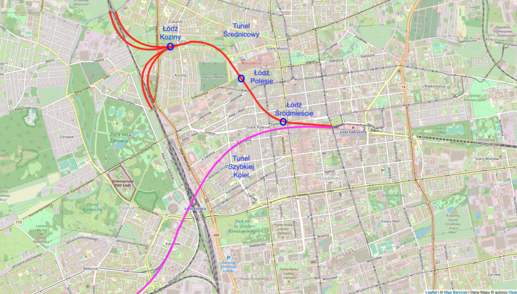 W maju 2025 roku, wydrążone były tunele jednotorowe połączenia; Łódź Fabryczna – Łódź Kaliska oraz Łódź Żabieniec. Przystąpiono do prac instalacyjnych i wykończeniowych. Największy z trzech przystanków osobowych na tej trasie, Łódź Koziny, będzie miał ruch pociągów prowadzony na dwóch poziomach. Montowano tutaj już perony. Na poziomie -1 będzie hol i trasy komunikacyjne. Przystanek osobowy Łódź Koziny będzie mieć 260 m długości i o około 75 m szerokości. Taka powierzchnia wymaga odpowiednich rozwiązań technicznych. Stropy poziomu -3 są wsparte na 75 filarach, a poziom -2 ma 40 filarów. Głębokość przystanku to 29 m, poniżej poziomu gruntu, a tory na poziomie 26 m. Do budowy przystanku wykorzystano 50 000 m sześciennych betonu. Tory będą ułożone na płytach betonowych i podtorzu. Prędkość w tuneli jest ograniczona do 80 km/h.